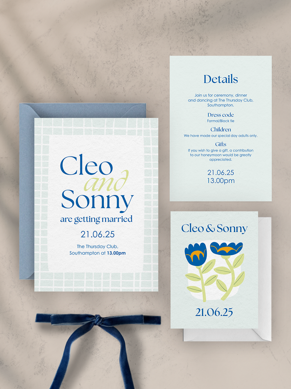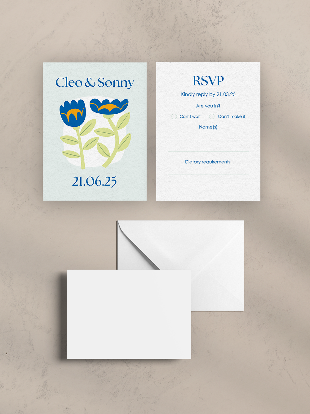 Our 3 item bundles include a 5x7” invitation, A6 details card, 90x120mm RSVP card & envelope and an envelope to house the bundle.