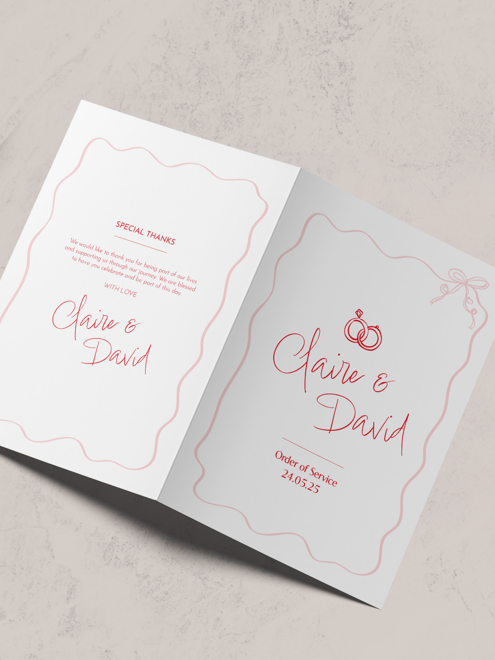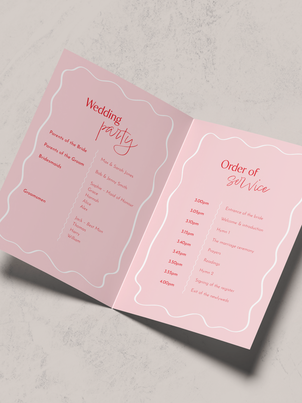 A5 finished order of service, folded along the long edge and printed on both sized – perfect for guiding guests around your day.