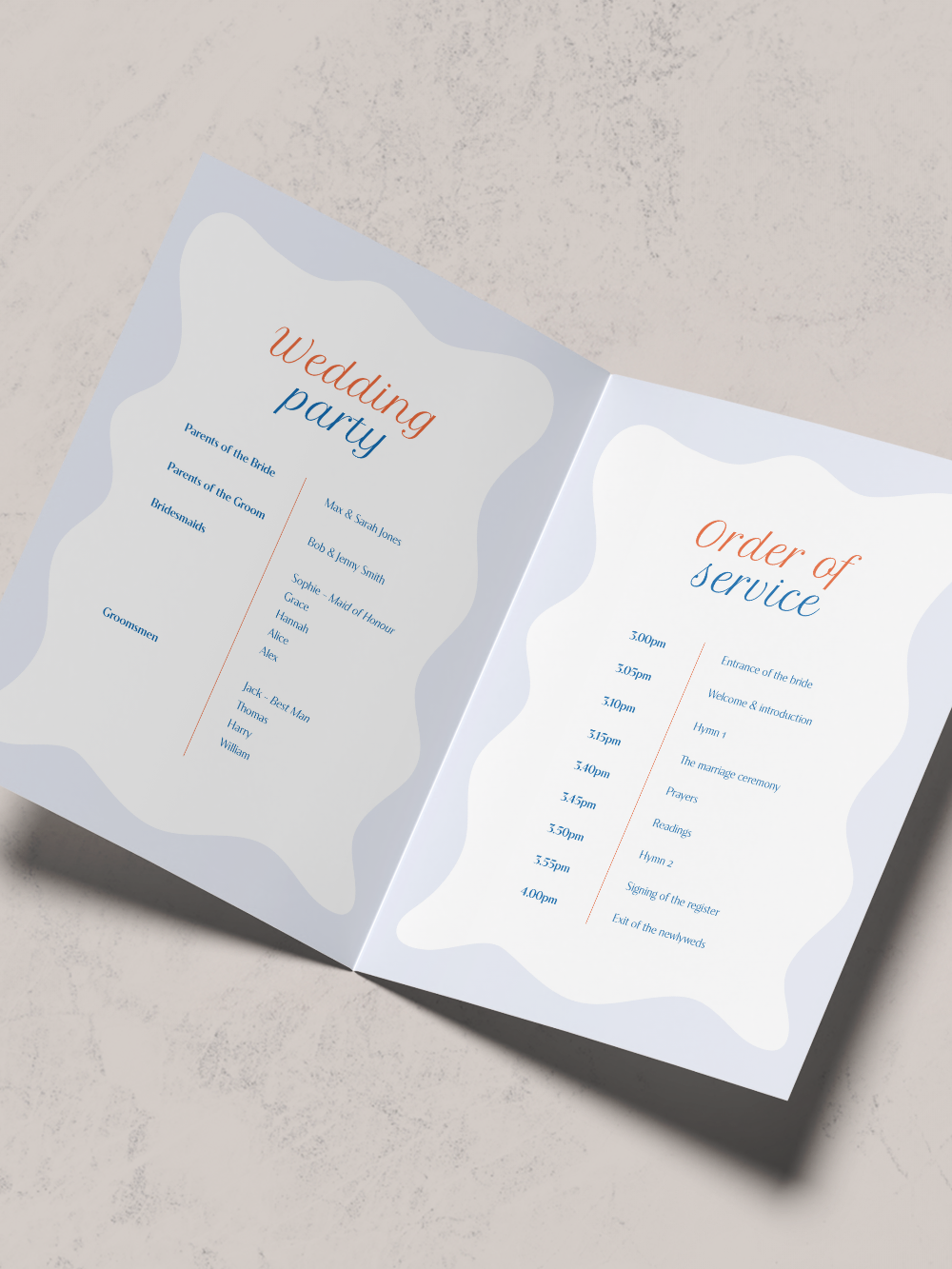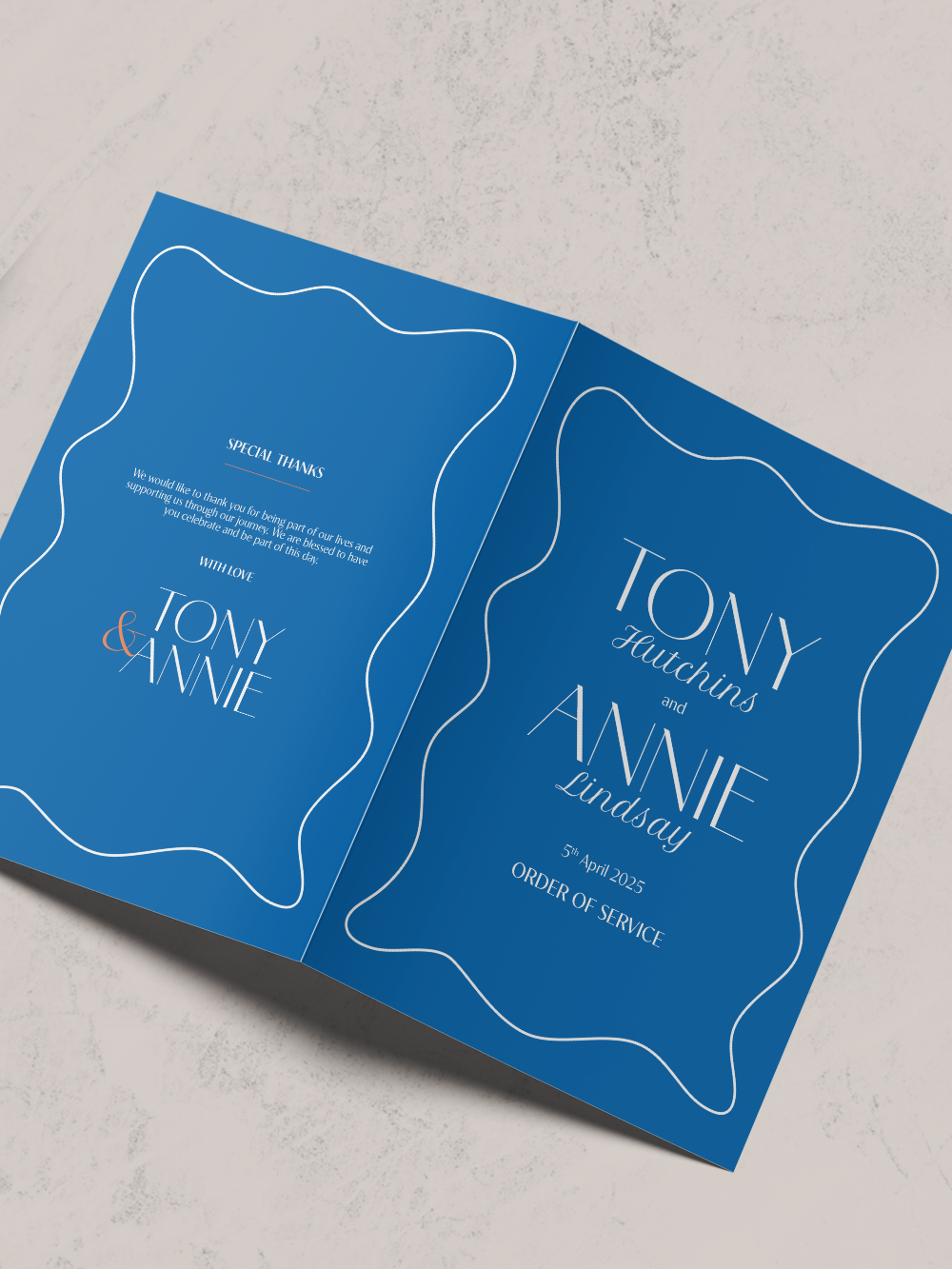 A5 finished order of service, folded along the long edge and printed on both sized – perfect for guiding guests around your day.